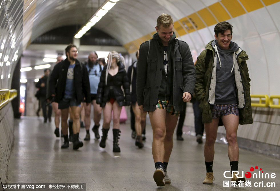 當(dāng)?shù)貢r(shí)間2016年1月10日,捷克布拉格,“地鐵無(wú)褲日”當(dāng)天,乘客穿短褲乘車(chē)。圖片來(lái)源:視覺(jué)中國(guó)