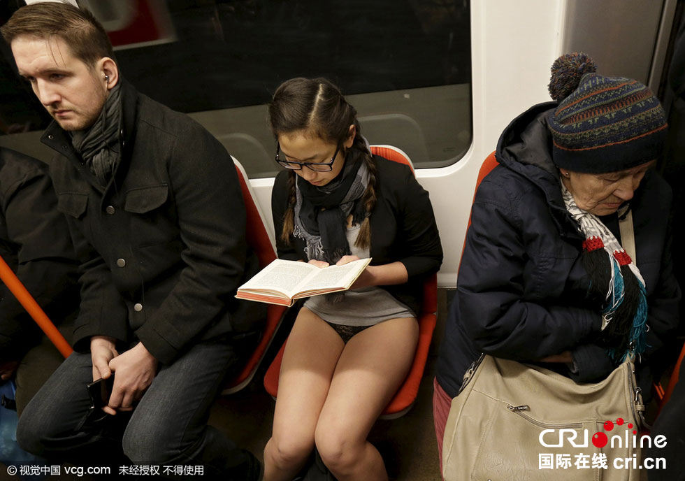 當(dāng)?shù)貢r(shí)間2016年1月10日,奧地利維也納,“地鐵無(wú)褲日”當(dāng)天,乘客穿短褲乘車(chē)。圖片來(lái)源:視覺(jué)中國(guó)