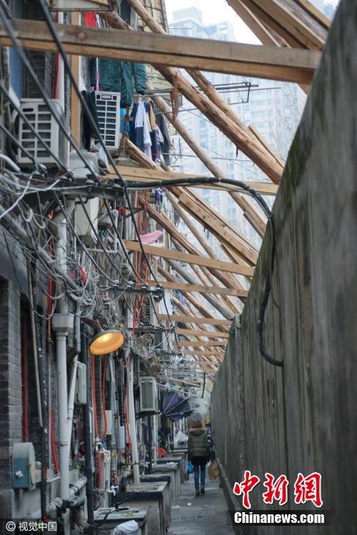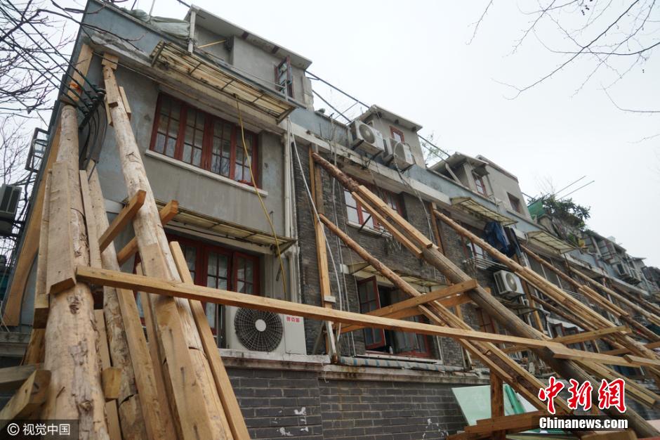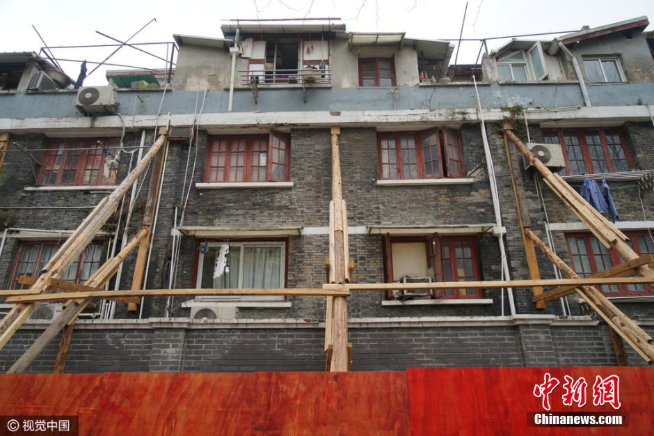 3月13日,上海黃浦區(qū),黃陂南路永年路一石庫門舊里房屋發(fā)生傾斜開裂,外墻用數(shù)十根木棒進行加固,場面十分壯觀,不少路人走過時都加快了腳步。據(jù)了解,此處房屋開裂傾斜是由于相隔一條馬路的兩個建筑工地野蠻施工造成。此段居民小區(qū)為上世紀20年代建成的磚木結(jié)構(gòu)石庫門建筑,房齡至今已經(jīng)90余年,受影響的居民就多達幾十戶。 圖片來源:視覺中國