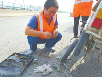 6日臨近中午,在中原路南水北調(diào)大橋附近,一位身穿環(huán)衛(wèi)工服裝的男子,正在路邊修補(bǔ)一輛電動三輪輪胎。只見他,技術(shù)嫻熟,從扒胎到補(bǔ)好胎安裝到位充氣,用時不到20分鐘。三輪車輪胎修補(bǔ)好,對方騎車離去,他則收好修車工具,又開始清掃馬路上的垃圾。