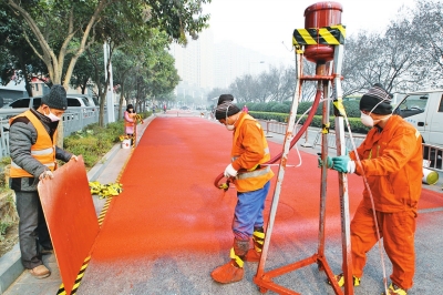 “機動車道6米寬,鋪設(shè)‘綠道’的自行車道也為6米寬。看慣了灰黑色的路面,在看到色彩明銳的‘綠道’后肯定覺得眼前一亮?!G道’只是叫法,并不是說道路外觀一定是綠色的,在景觀設(shè)計中,‘綠道’往往有著更深更廣的內(nèi)涵?!惫こ特?fù)責(zé)人呂先生告訴記者,彩色瀝青厚度僅為1到2毫米,壽命在5年以上,具有警示、防滑、降噪、美觀等特點?!拔覈G道’通常以警示色紅色為主打,主要作用是打造人車分離模式,供騎車者和步行者休閑使用。”